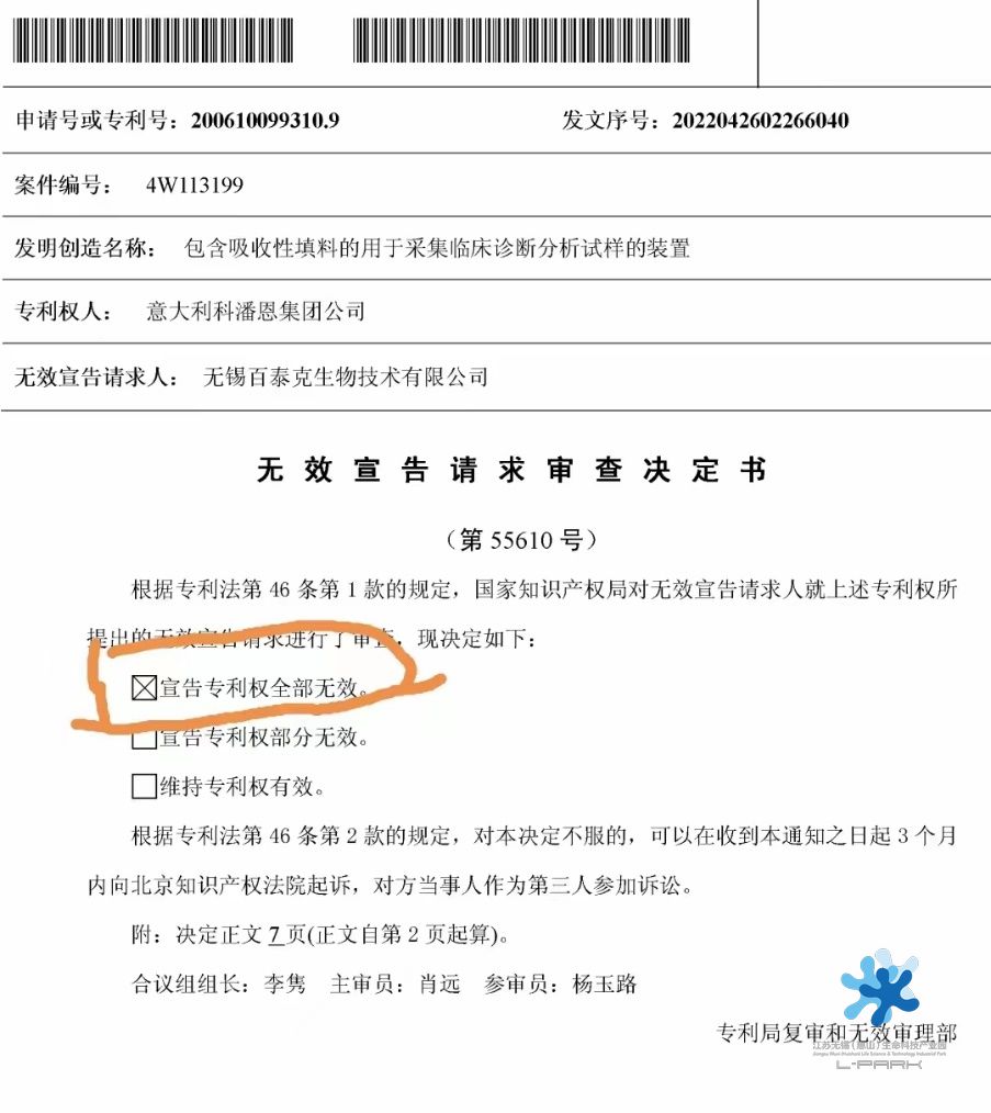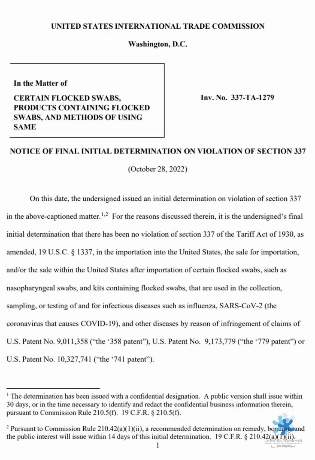 (美國華盛頓時(shí)間)10月28日,美國國際貿(mào)易委員會(huì)(ITC)就Copan?Italia S.P.A 、Copan Industries,?Inc主張對美出口、在美進(jìn)口及銷售的植絨拭子侵犯其專利權(quán)申請調(diào)查發(fā)布公告,宣布無錫百泰克生物技術(shù)有限公司等五家中國企業(yè)的植絨拭子不侵犯其相關(guān)專利權(quán);意味著橫梗中國植絨拭子出口美國市場的專利障礙已消除,拭子產(chǎn)業(yè)出海之路暢行無阻。